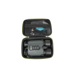 Корпус выполнен из прочного полиамида, устойчивого к механическим воздействиям и влаге. Эргономичная форма делает прибор удобным для удержания в любых условиях. Регулируемое межзрачковое расстояние обеспечивает комфорт при использовании как взрослыми, так и подростками. Для длительного наблюдения прибор устанавливается на штатив. Вес устройства составляет 880 г. Управление осуществляется кнопками и вращающимся энкодером, расположенным между окулярами.